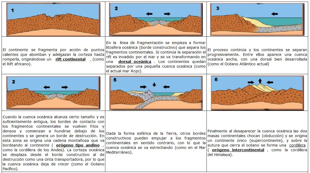 El ciclo de Wilson describe los movimientos de las placas y los procesos geológicos asociados a la dinámica de sus bordes, de modo cíclico; empezando por la fragmentación de los continentes y acabando por las colisiones de múltiples continentes que generan supercontinentes. Se ha comprobado que estos ciclos han ocurrido a lo largo de la historia de la Tierra de modo que los continentes se mueven, se fragmentan, se separan, colisionan y se vuelven a unir en ciclos con intervalos de 500 Ma aproximadamente.