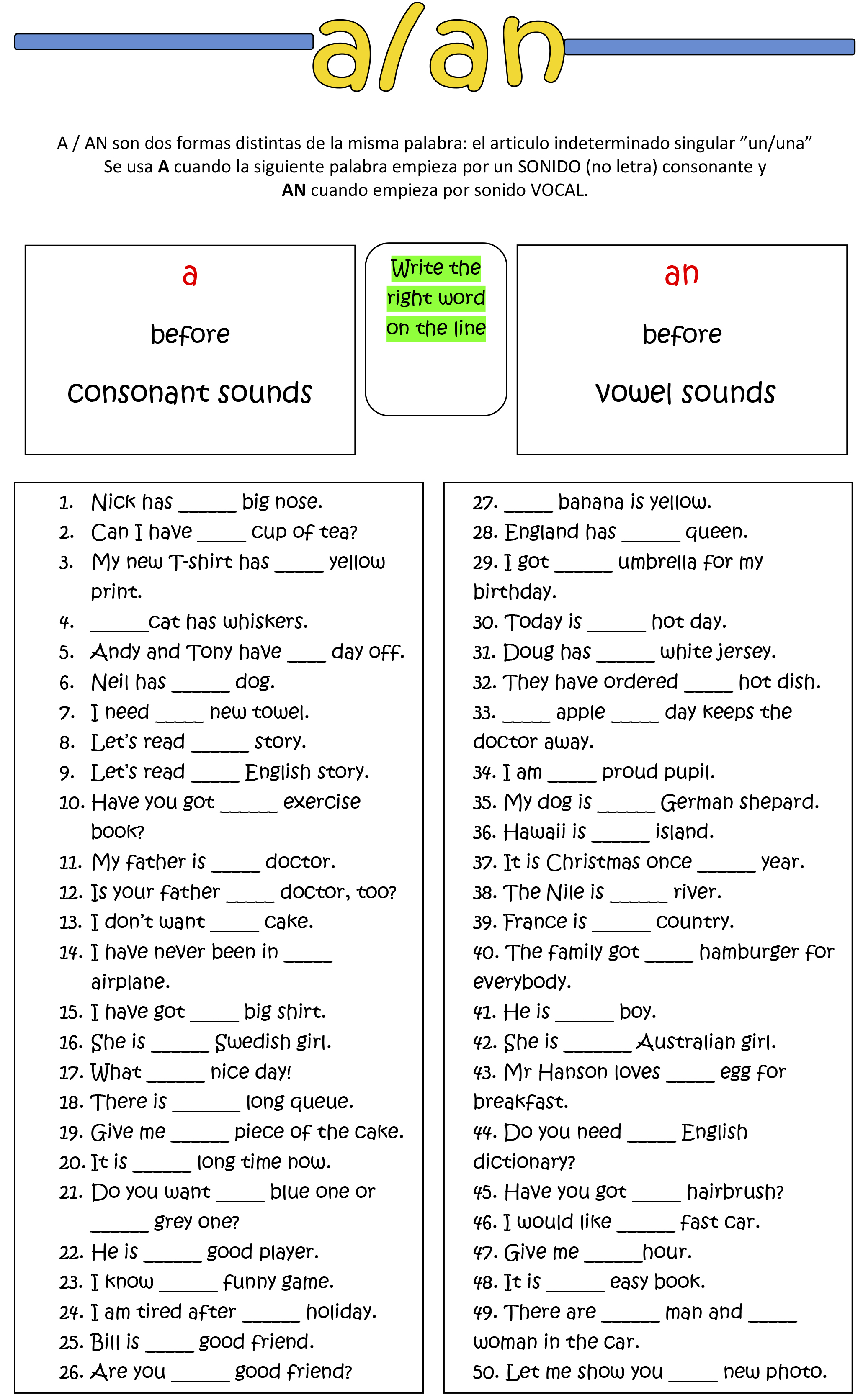 A continuación tienes una ficha con la explicación del artículo indeterminado en inglés. Observarás que tiene dos formas: "A" y "AN". Según se pronuncie la palabra a la que va acompañando, utilizaremos uno u otro. La traducción es la misma: "un / una"
