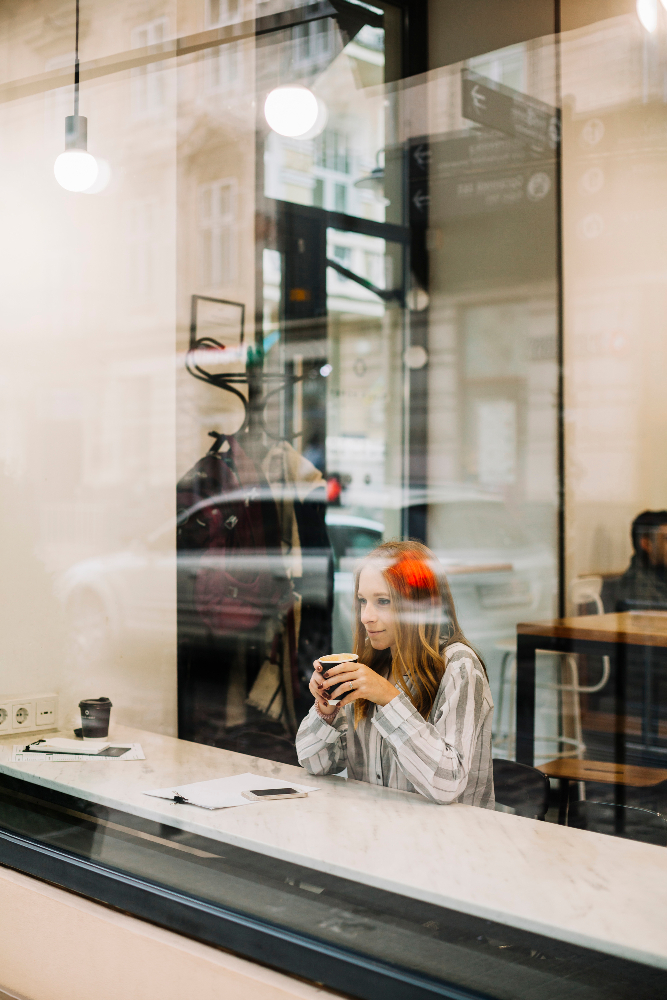 But today, things are a bit different. Right now, I'm sitting in a cafè, and it's 1:30 p.m. I'm not at the bookshop, and I'm not helping customers. Instead, I'm having a caffè-latte by the window, enjoying the view outside.