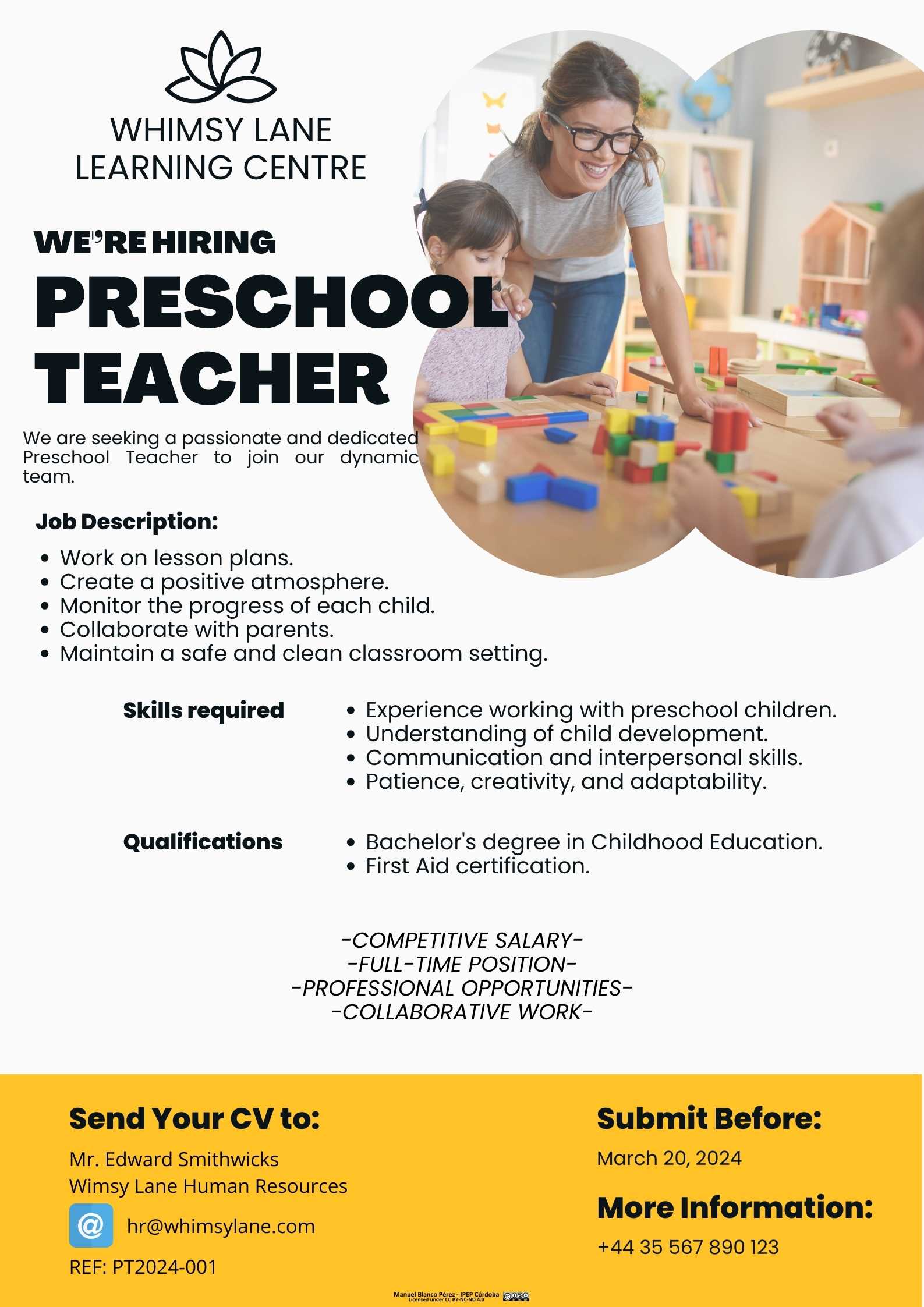 En esta OFERTA DE TRABAJO, el Centro Escolar "Whimsy Lane" está buscando un profesor de educación infantil.